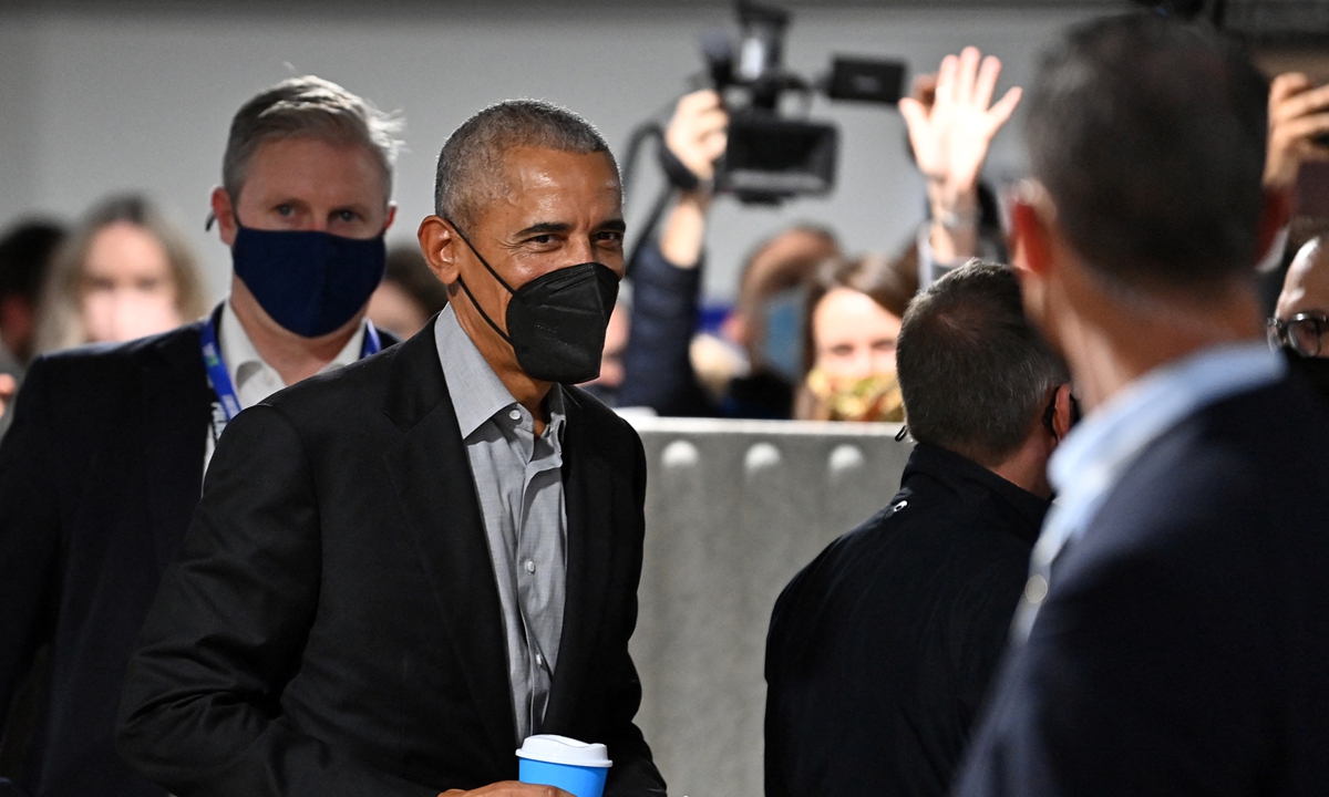 Former US President Barack Obama, wearing a face mask, leaves after attending a meeting on day nine of the COP26 UN Climate Change Conference in Glasgow, Scotland on November 8, 2021.